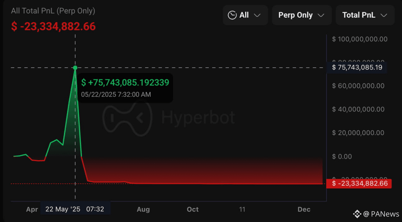 同样是合约交易,James Wynn 的神话始于 PEPE,但爆发于 Hyperliquid 的合约战场。2025 年 3 月,James Wynn 带着从 PEPE 赚到的 2500 万美元巨款杀入 Hyperliquid 开启了合约交易。这笔 2500 万美元的巨款是其靠仅仅 7600 美元的本金从 2023 年重仓押注 Meme 币 PEPE 赚到的,但现货的涨幅满足不了他,在 3 月至 4 月期间,他通过激进做多 PEPE 和 ETH,再次获利 2500 万美元,变成了手握 5000 万美元的超级巨鲸。