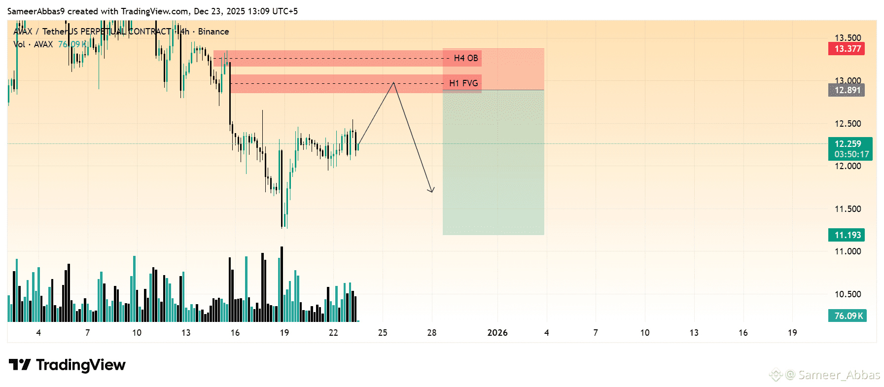 AVAX is currently slightly range bound on the smaller timeframes but is bearish on the larger timeframes like H1 and H4 and there is liquidity level at $12.649 so there is a chance it will go above to grab the liquidity and then into our sell zone and we will short AVAX from the h1 and h4 FVG+OB in futures trading.