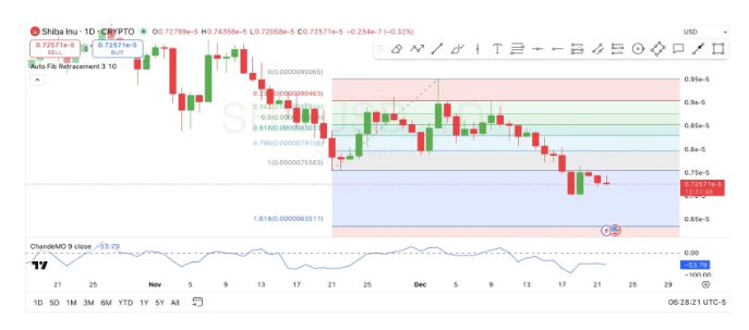 ✨ 這一階段對於更廣泛的迷因幣空間很重要,因為柴犬幣通常反映整體情緒。如果當前支撐保持,可能會穩定價格並在短期內平息波動性。突破這一區域可能會將 SHIB 推向更低的斐波那契水平。價格在這些技術邊界的反應可能會影響近期投機性加密資產的情緒。