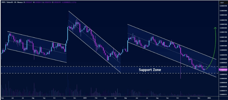 PEPE/USDT 3日圖表顯示,價格目前正在測試0.00000399美元附近清晰下降通道的下軌,該位置與一個關鍵支撐區域重合,該區域大致位於0.00000330美元至0.00000440美元之間。歷史上,市場曾多次守住該支撐位,並在持續下行壓力後反彈,這表明買家正在這些價位入場。該區域的反覆防守表明存在吸籌,這可能爲在持續拋售壓力後出現反轉奠定基礎。