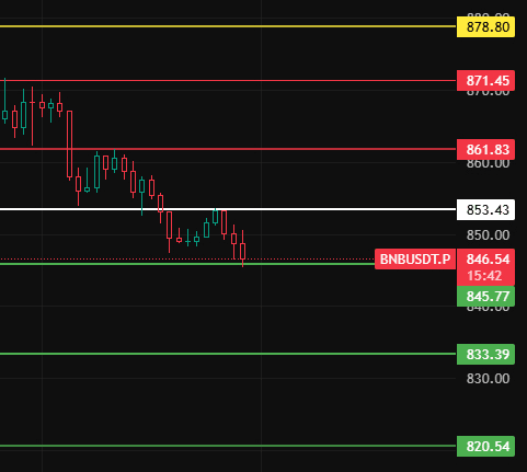BNB夜間留意853這個位置,只要反彈上不去此位置,那說明反彈沒有力度,繼續下跌下方支撐位留意845-833-820這幾個位置附件!