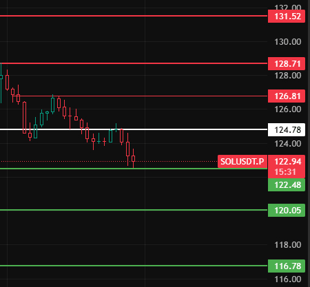 SOL夜間留意124這個位置,只要反彈上不去此位置,那說明反彈沒有力度,繼續下跌下方支撐位留意122-120-117這幾個位置附件!