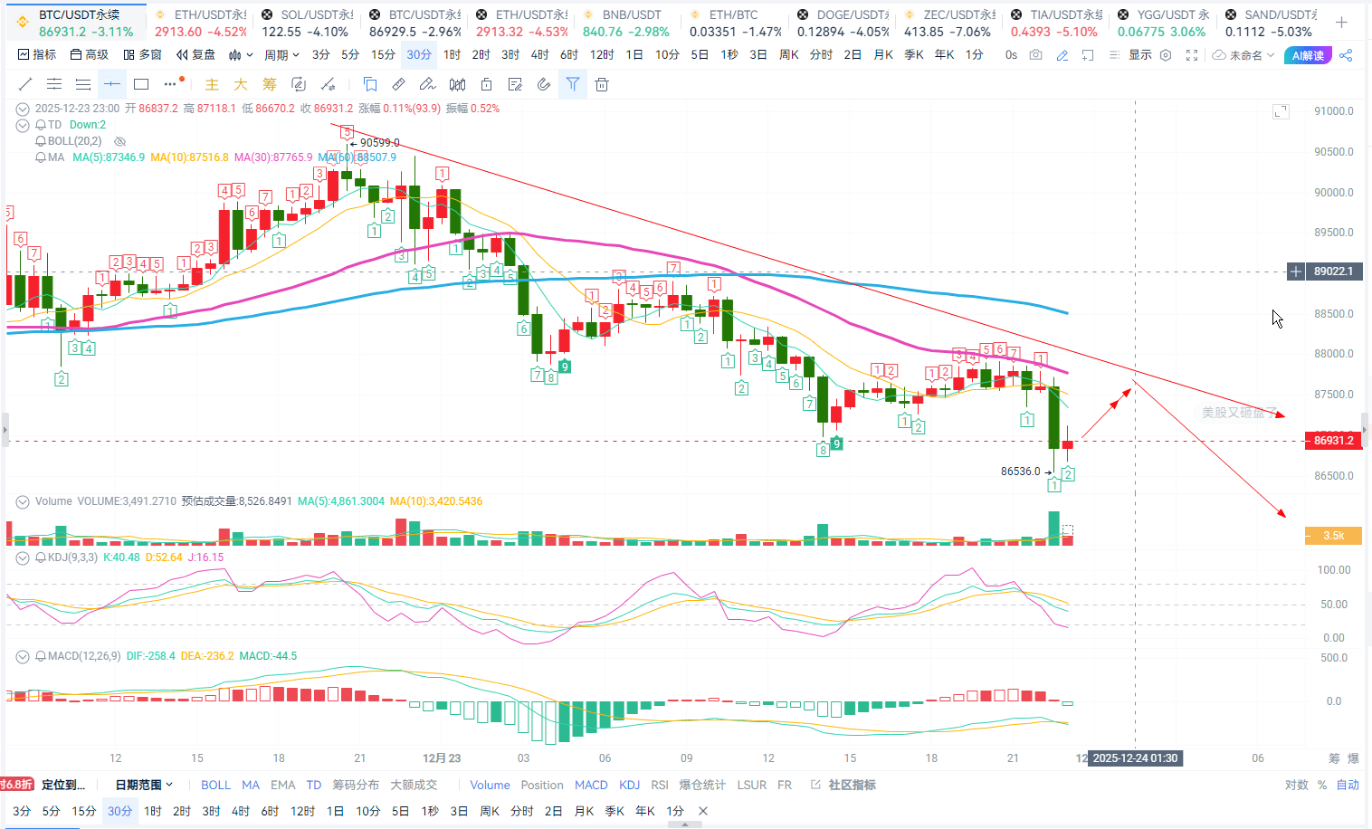4小時線由於日內的高開低走,目前幣價運行在BOLL帶下軌附近,MACD 與KDJ呈箜頭情緒發散,MA5 10日均線偏向震盪走跌,加上TD指標來到下跌TD6預計晚間及凌晨幣價會先走跌後再次開啓反抽走勢,其高點壓制參考在88300-89000一線,低點支撐參考在84500-84000一線。所以所以對於凌晨走勢而言個人看法還是保持短線波段,圍繞反彈高箜爲主低哆爲輔思路