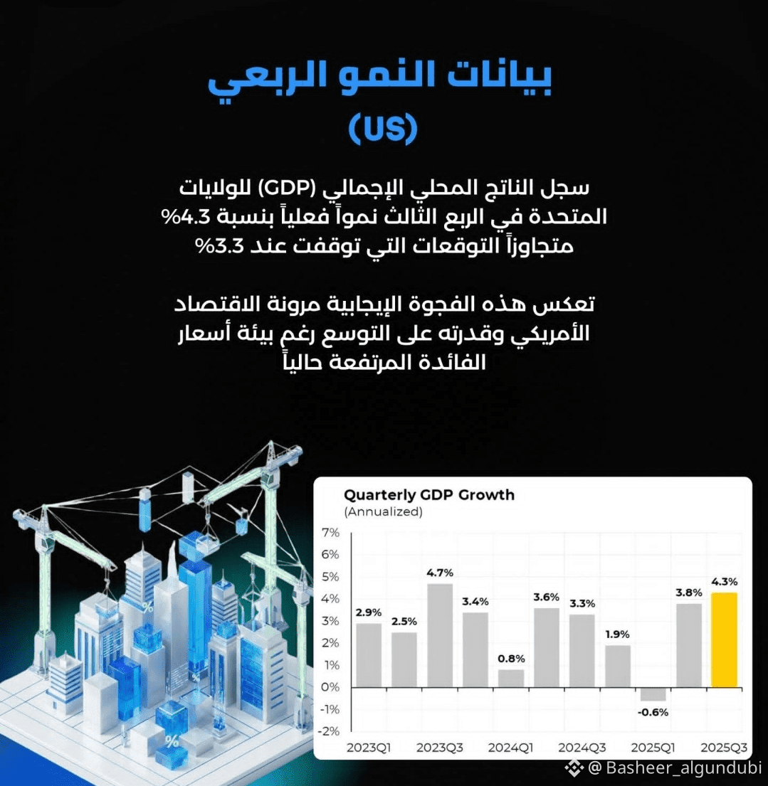 أظهرت بيانات الربع الثالث قوة الاقتصاد الأمريكي بتسجيل ناتج محلي إجمالي (GDP) بنسبة 4.3%، متجاوزاً التوقعات بفارق ملحوظ.