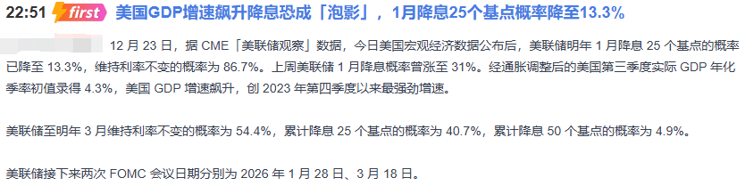 美國三季度GDP增速飆到 4.3%,創一年多新高!結果市場嚇壞了:美聯儲1月降息概率從31%猛跌到 13.3%。加息雖停了,但降息?再等等吧!