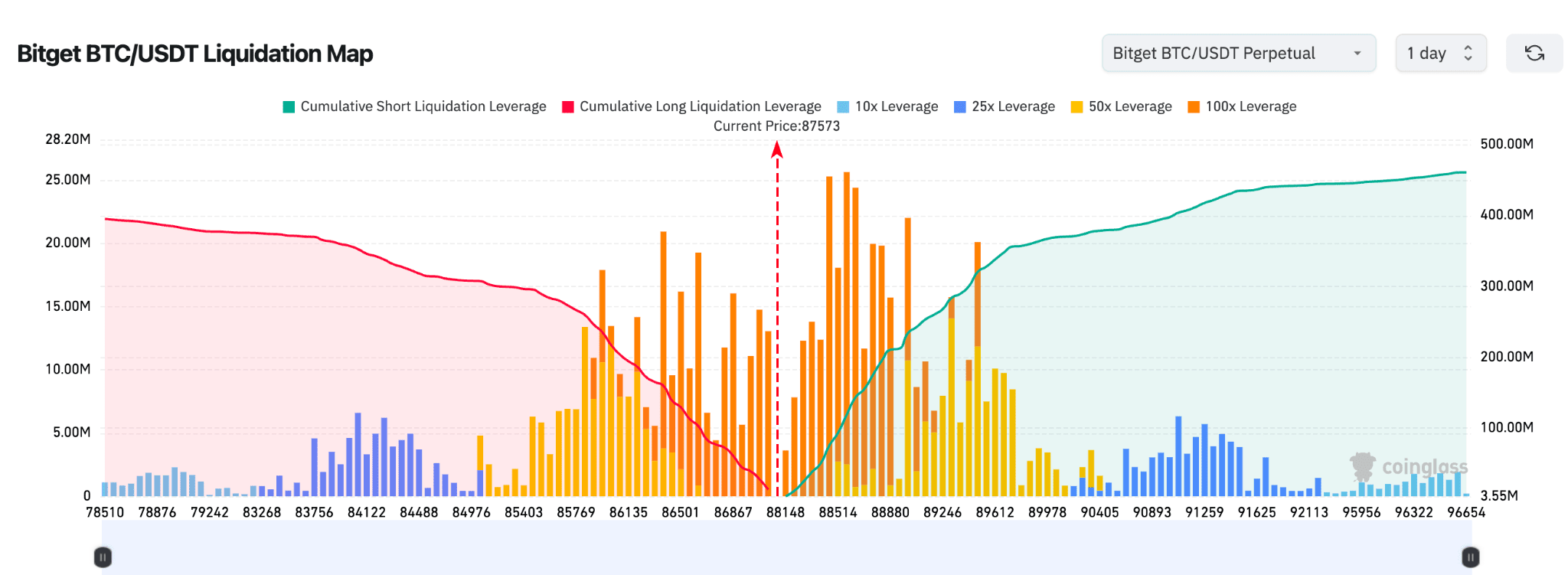 3、Bitget BTC/USDT清算地圖顯示:當前價約 87,5k 附近正處於多空清算分界點,上方 88k–90k 區間堆積大量 50x–100x 槓桿多單,一旦放量突破,容易觸發多頭擠倉式快速拉昇。下方 85k–86k 一帶空頭清算與支撐相對薄弱,若出現假突破回落,價格可能快速下探,整體呈現“多頭擁擠、波動放大、易被獵殺”的結構。