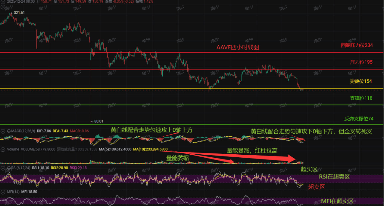 技術指標很誠實:MACD在零軸下邊,眼看金叉要變死叉,這是下跌中繼的信號。但注意看!RSI和MFI都趴在了超賣區,這意味着什麼?意味着短期跌得太猛,彈簧壓得太緊,隨時可能給你來個反彈!