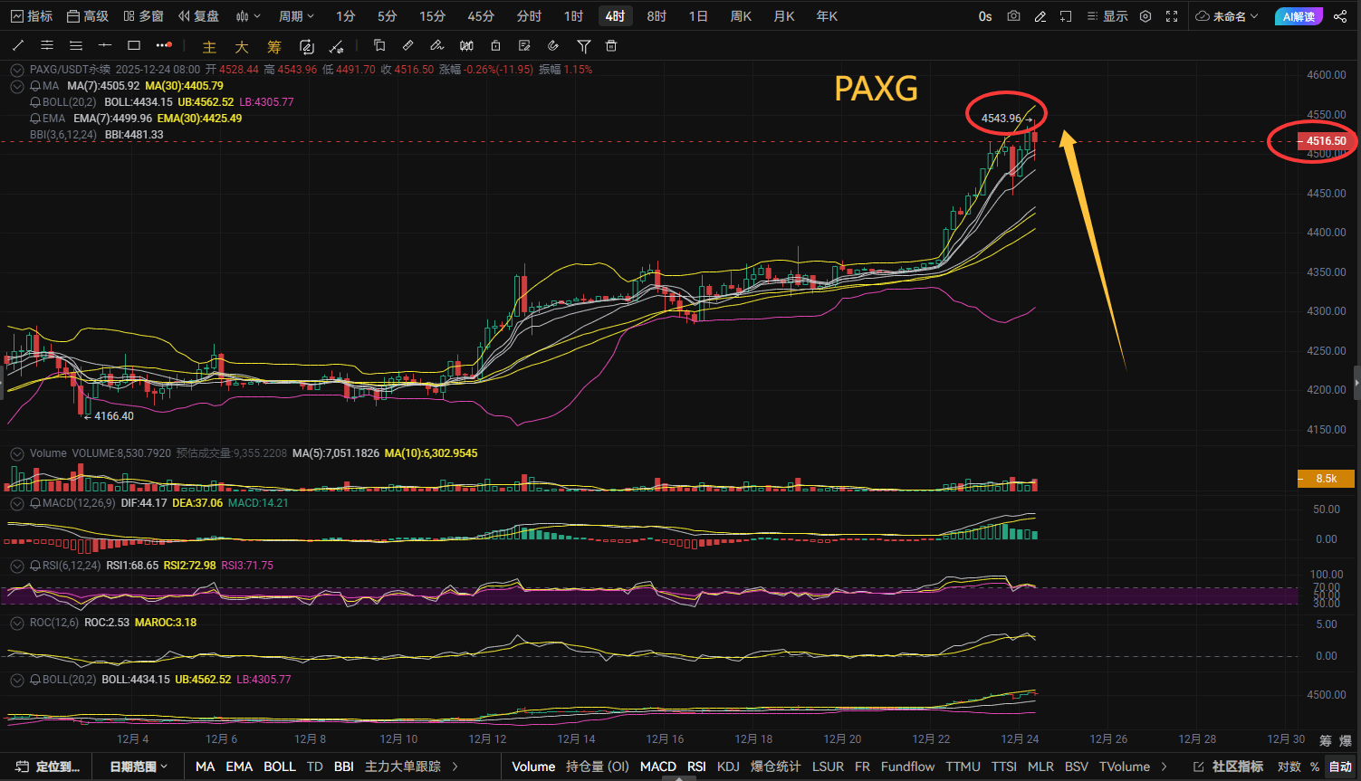 別想着全倉追高!黃金短期衝太快,PAXG 4小時K線顯示KDJ死叉,有回調風險。建議用3成閒錢布局:比如有10萬,拿3萬買PAXG,就算短期回調也不慌,剩下的錢留着補倉。