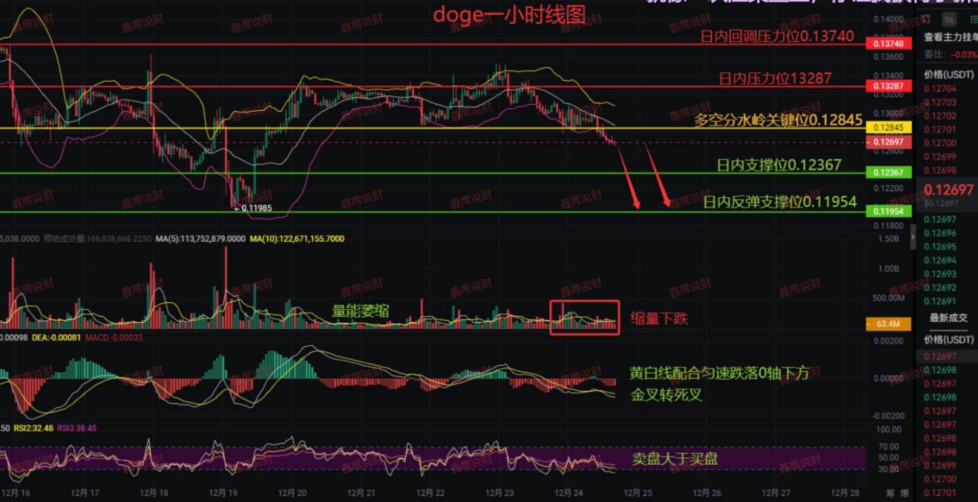 兄弟們注意,DOGE一小時圖已經走出“標準下跌通道”!MACD黃白線在0軸下方死叉開口,量能萎縮得像被抽乾了血——這不是洗盤,這是主力明牌撤退的信號!我是鷹哥,直接上結論:天黑請閉眼,多單請謹慎,下面帶你拆解關鍵位置與逃生路線。