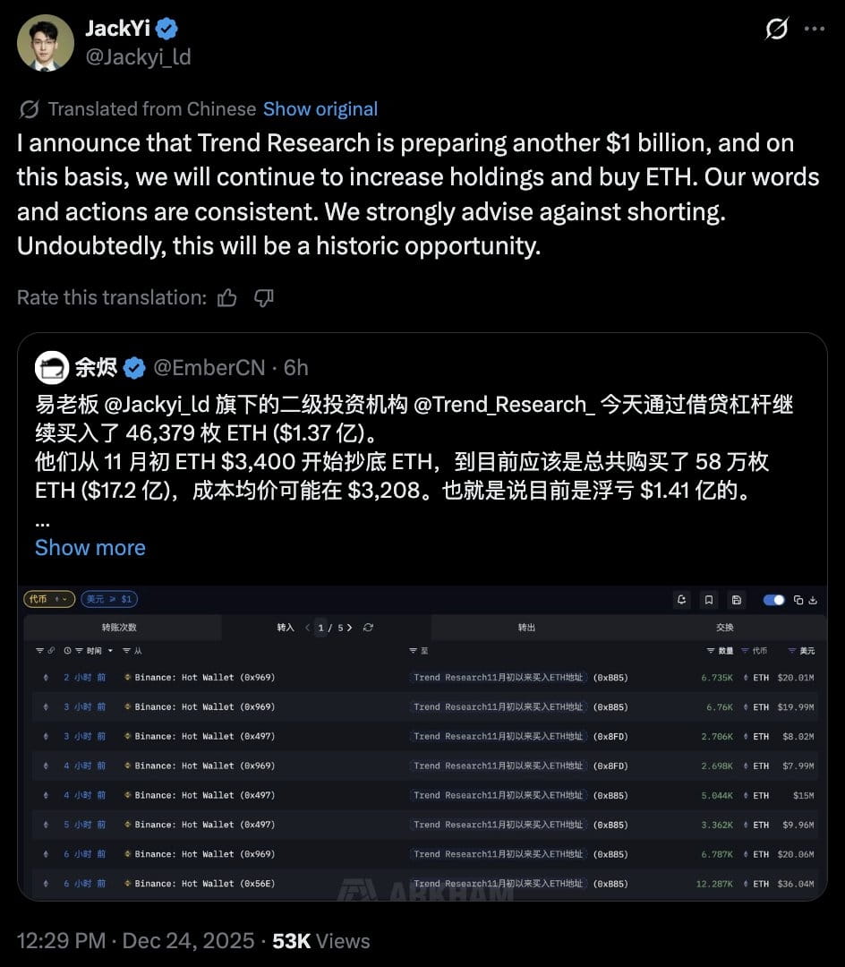 Trend Research投資策略最新消息:Trend Research創始人Jack Yi表示,他們正準備額外10億美元購買$ETH。同時,強烈建議不要做空市場。