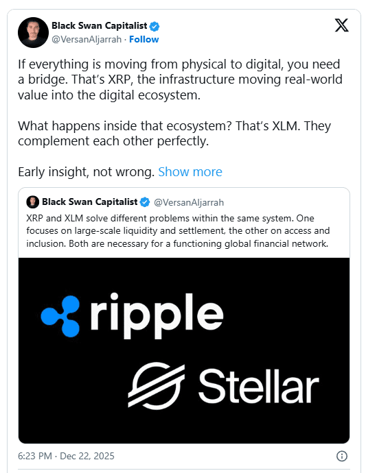 Aljarrah評論的一個核心主題是XRP和XLM不應被視爲競爭對手。相反,他認爲它們旨在在統一的全球框架內互補。