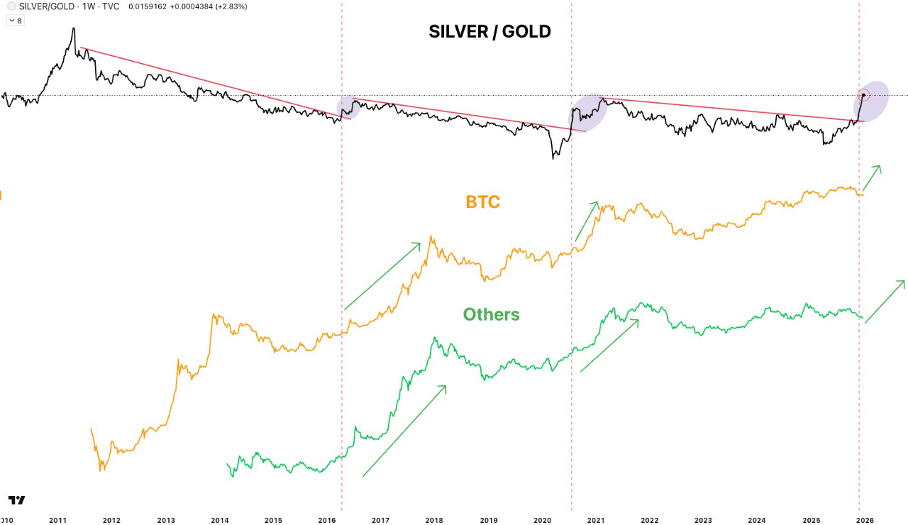 從宏觀經濟的角度看,銀與黃金的比例繼續測試長期下降阻力,這是歷史上作爲轉向風險資產的領先指標。當資本從防禦性資產轉移時,像貴金屬、比特幣及其他高貝塔係數資產通常是主要受益者。