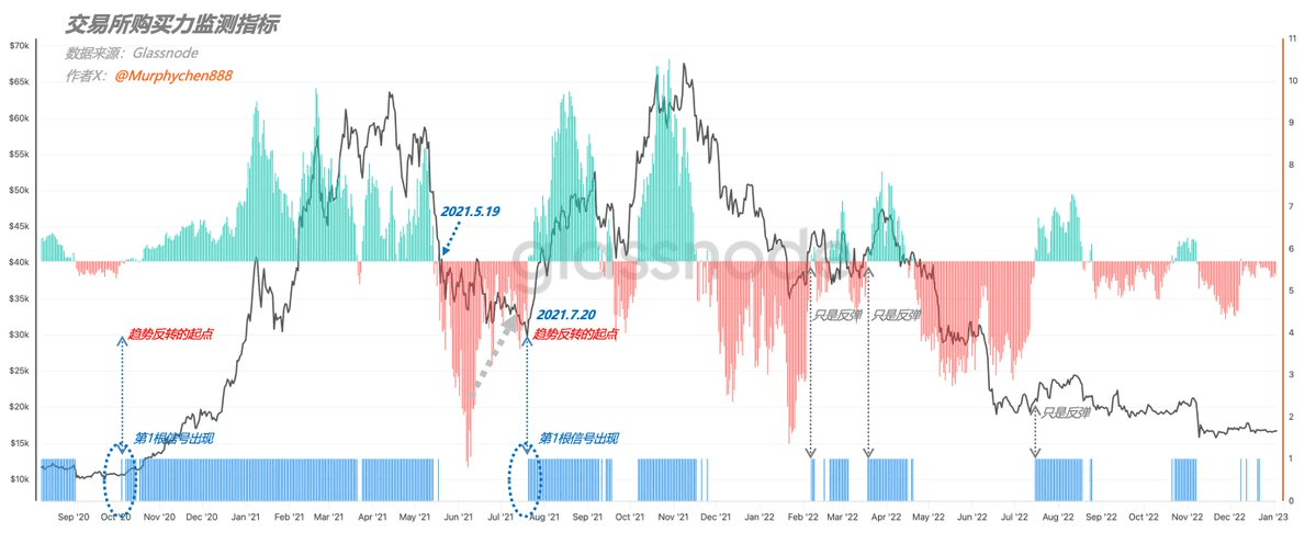 再舉個例子:21年519黑天鵝事件發生時,BTC已經從6.3w高點跌至3.7w;但此時我們看到“交易所購買力”信號顯示的是“從有到無”,此後繼續下跌,直到7月20日出現了第1根藍色信號開始反轉。