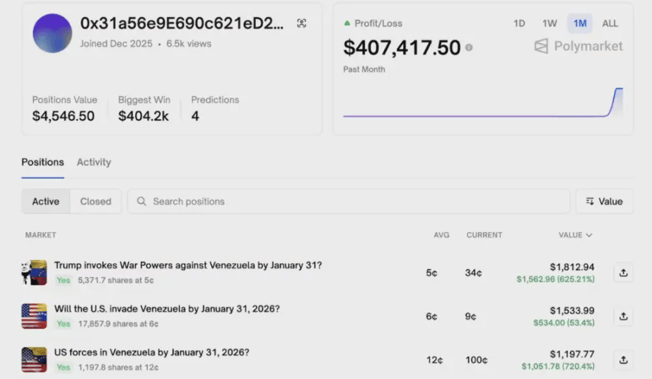 交易記錄顯示,該賬戶在週五晚上,即軍事行動消息公開前的數小時內大舉建倉。當時,市場對於美國干預委內瑞拉的概率預估僅爲 6% 左右。隨着特朗普在週六凌晨確認美國已捕獲馬杜羅,該賬戶的頭寸價值飆升,最終獲利 404,222 美元,回報率高達 1242%。