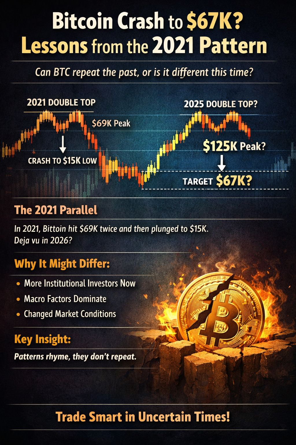 #Bitcoin 再次處於關鍵點,而當前的價格結構開始讓許多交易者想起2021年的週期。那時,$BTC BTC在接近$69K時見頂,形成了經典的雙頂模式,隨後經歷了近80%的慘烈修正,價格跌至$15K區域。有趣的是,那個$15K區域後來轉變爲一個強大的支撐位——下一階段#bullish 的基礎。