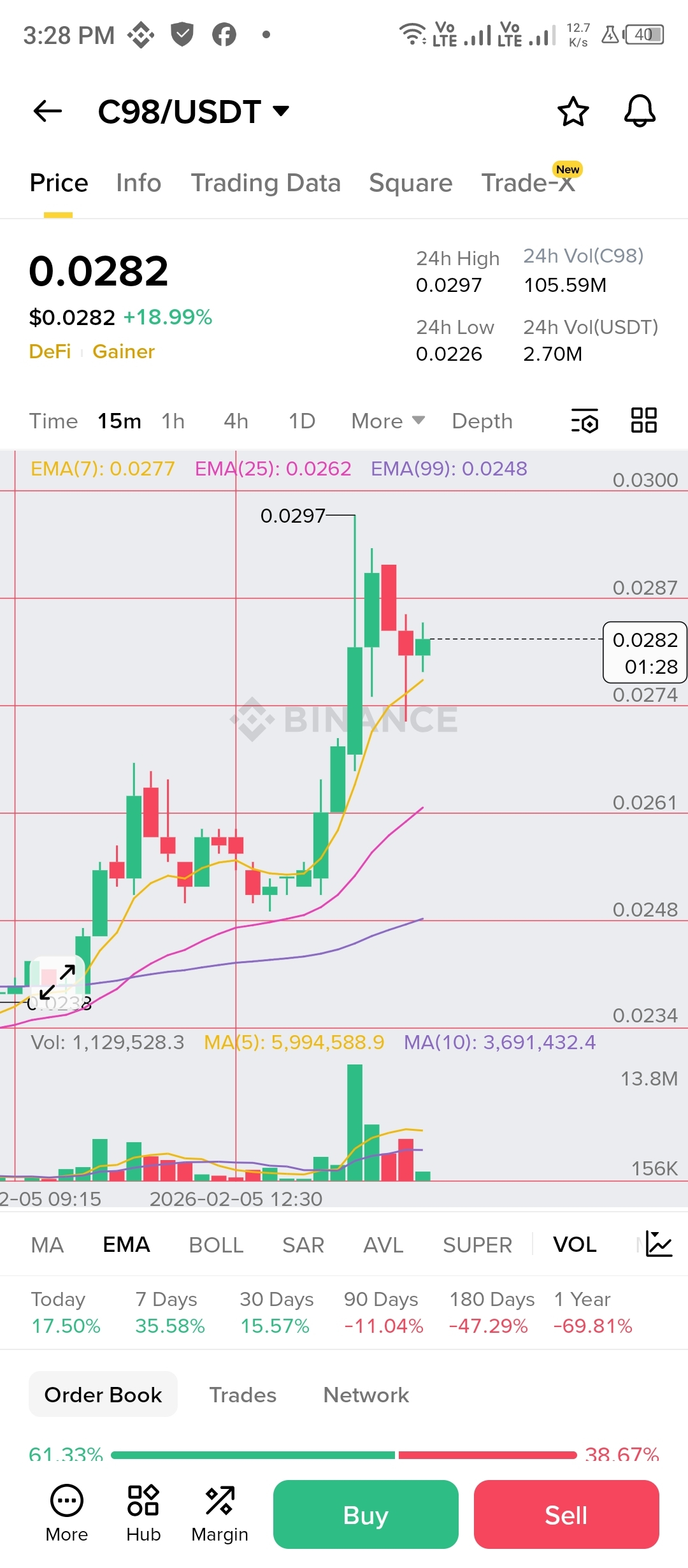 C98 最近的上漲是一個動能突破,發生在積累之後,得到 EMA 對齊、交易量擴張和市場輪換到 DeFi 替代幣的支持。